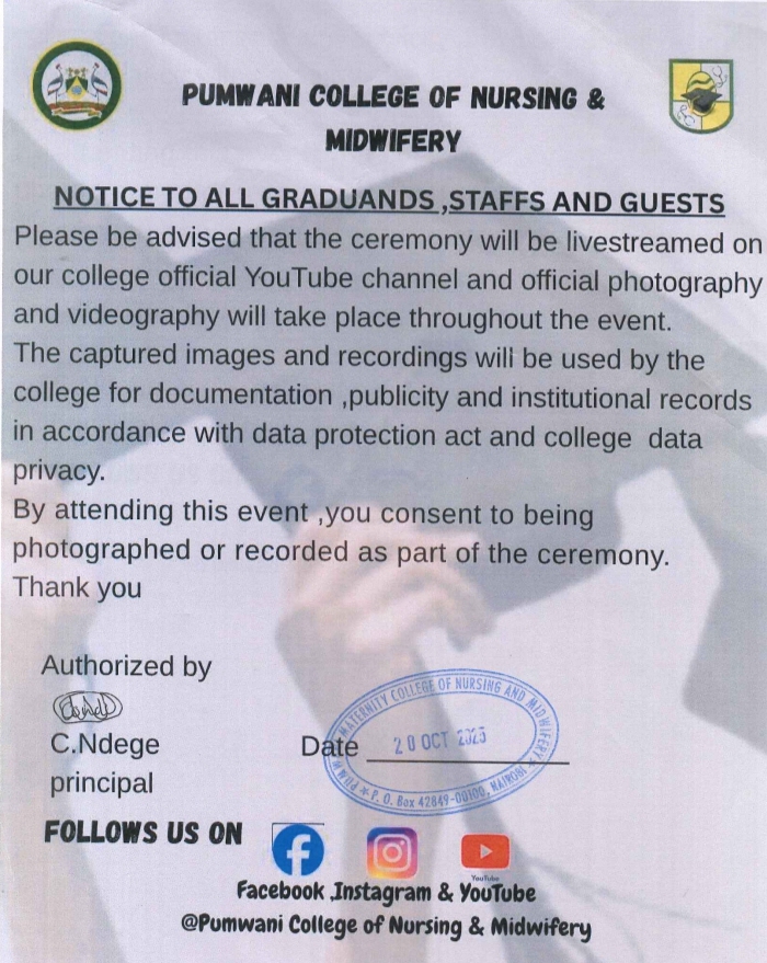 Pumwani College Of Nursing & Midwifery 70th Graduation Ceremony. To Be held On 21st November 2025. Find Graduation Instructions Here>>>>>>>PCNM GRADUATION INSTRUCTIONS